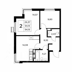 Второй вариант: без черновой отделки. Возведены межкомнатные перегородки, произведена гидроизоляция пола в ванной, оконные блоки из ПВХ-профиля 70мм.