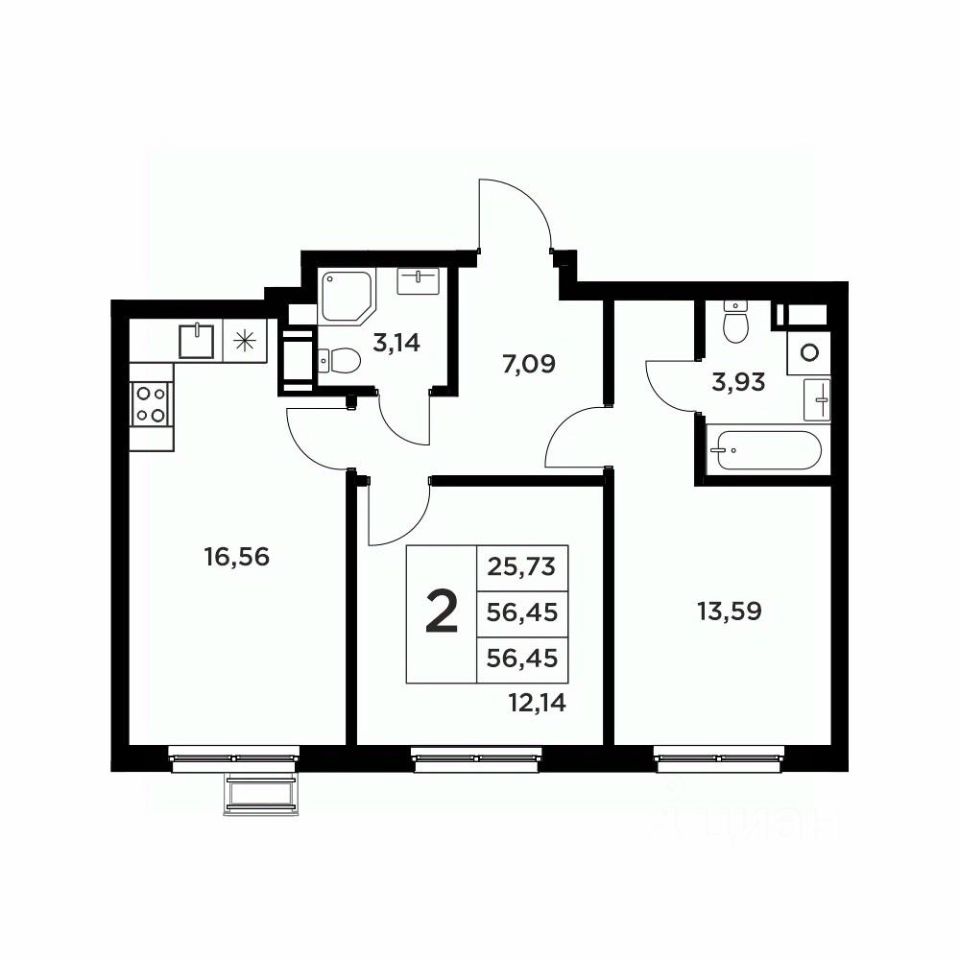 Второй вариант: без черновой отделки. Возведены межкомнатные перегородки, произведена гидроизоляция пола в ванной, оконные блоки из ПВХ-профиля 70мм.