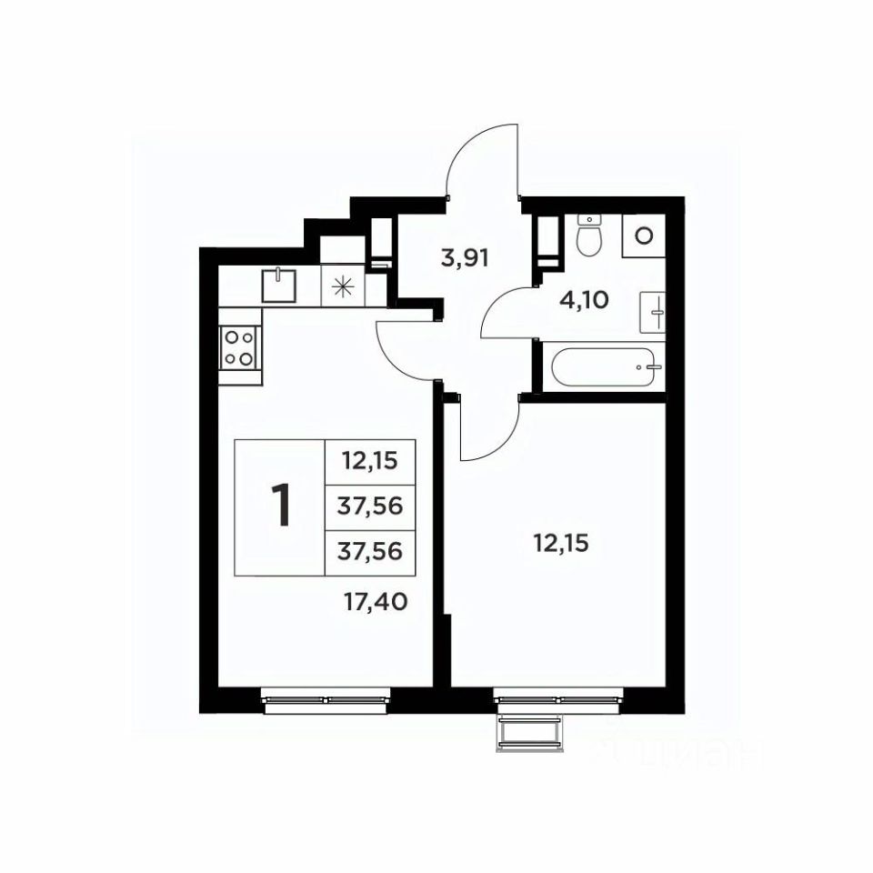 Второй вариант: без черновой отделки. Возведены межкомнатные перегородки, произведена гидроизоляция пола в ванной, оконные блоки из ПВХ-профиля 70мм.