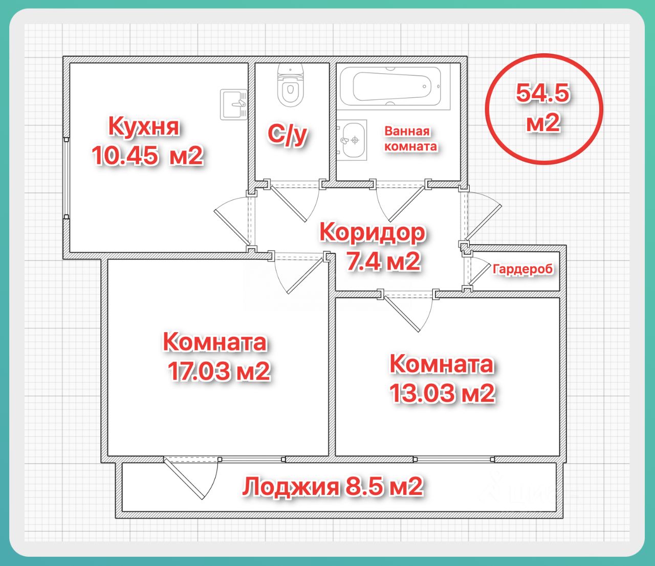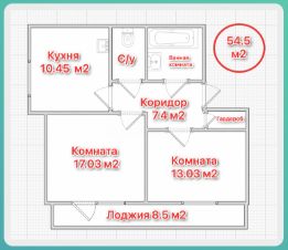 Просторная двухкомнатная квартира, площадь квартиры с учётом лоджии составляет 63,0 кв. м., две уютные комнаты: 17,0 кв. м., и 13,0 кв. м., кухня со встроенным кухонным гарнитуром и встроенной техникой 10,5 кв. м, просторный коридор 7,4 кв. м., санузел раздельный, большая застекленная лоджия 8,5 кв. м., есть небольшая гардеробная комната 1,5 кв.м.