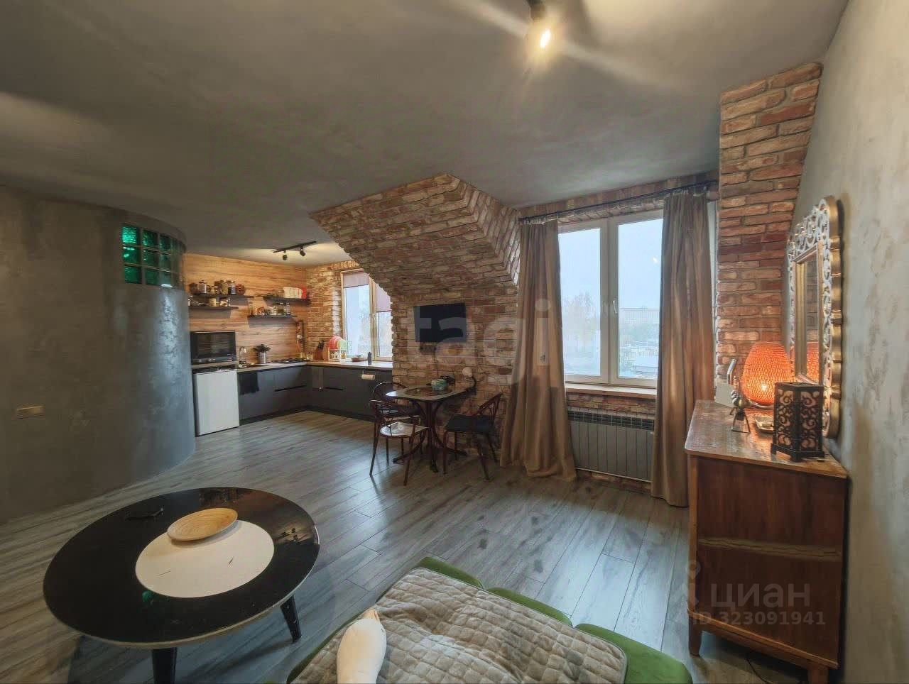 Параметры: Первый этаж: просторная студия с кухней-гостиной,(стены одеты в кирпич 18 века из Санкт-Петербурга), с большим диваном на заказ (2 спальных места), Встроенная кухня с окном прямо над рабочей зоной, теплый пол на всей поверхности. Пол - керамическая плитка под дерево. Потолок и стены микро-цемент с росписью. Подоконники деревянные.