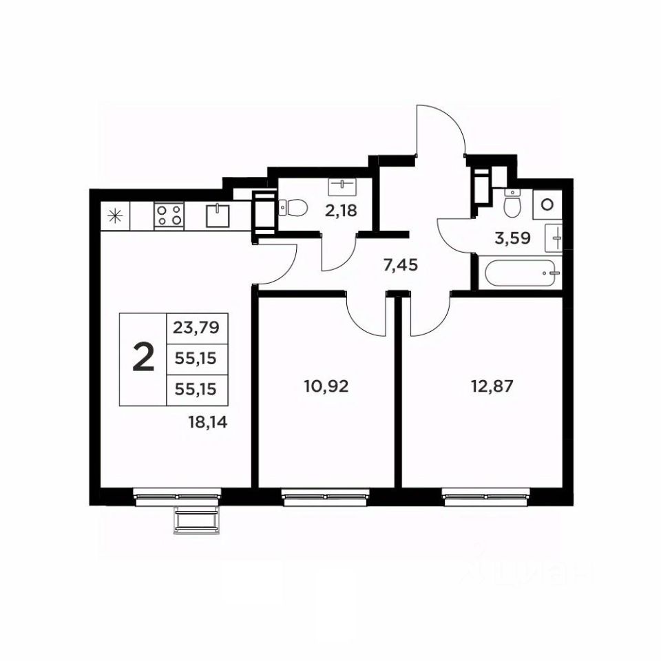 Второй вариант: без черновой отделки. Возведены межкомнатные перегородки, произведена гидроизоляция пола в ванной, оконные блоки из ПВХ-профиля 70мм.