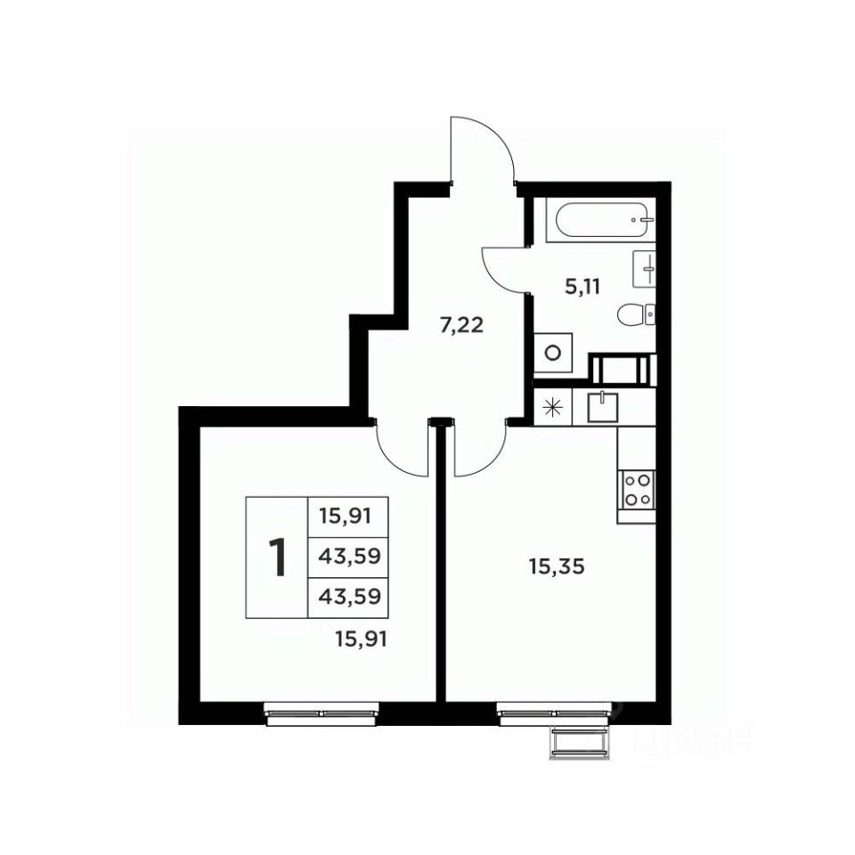 Второй вариант: без черновой отделки. Возведены межкомнатные перегородки, произведена гидроизоляция пола в ванной, оконные блоки из ПВХ-профиля 70мм.