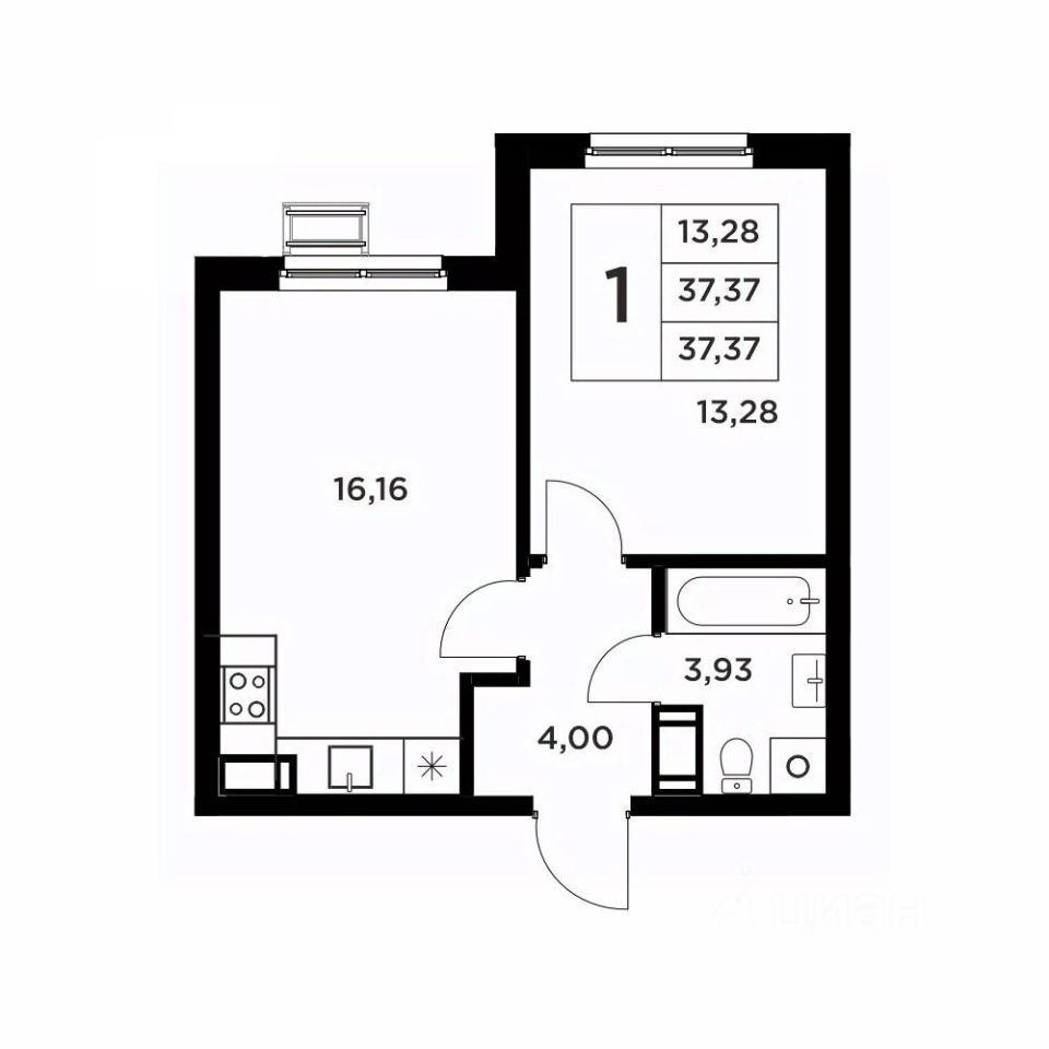 Второй вариант: без черновой отделки. Возведены межкомнатные перегородки, произведена гидроизоляция пола в ванной, оконные блоки из ПВХ-профиля 70мм.
