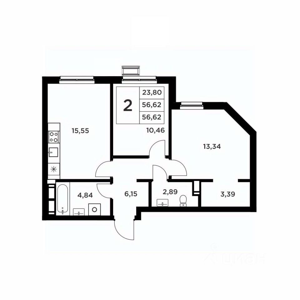 Второй вариант: без черновой отделки. Возведены межкомнатные перегородки, произведена гидроизоляция пола в ванной, оконные блоки из ПВХ-профиля 70мм.