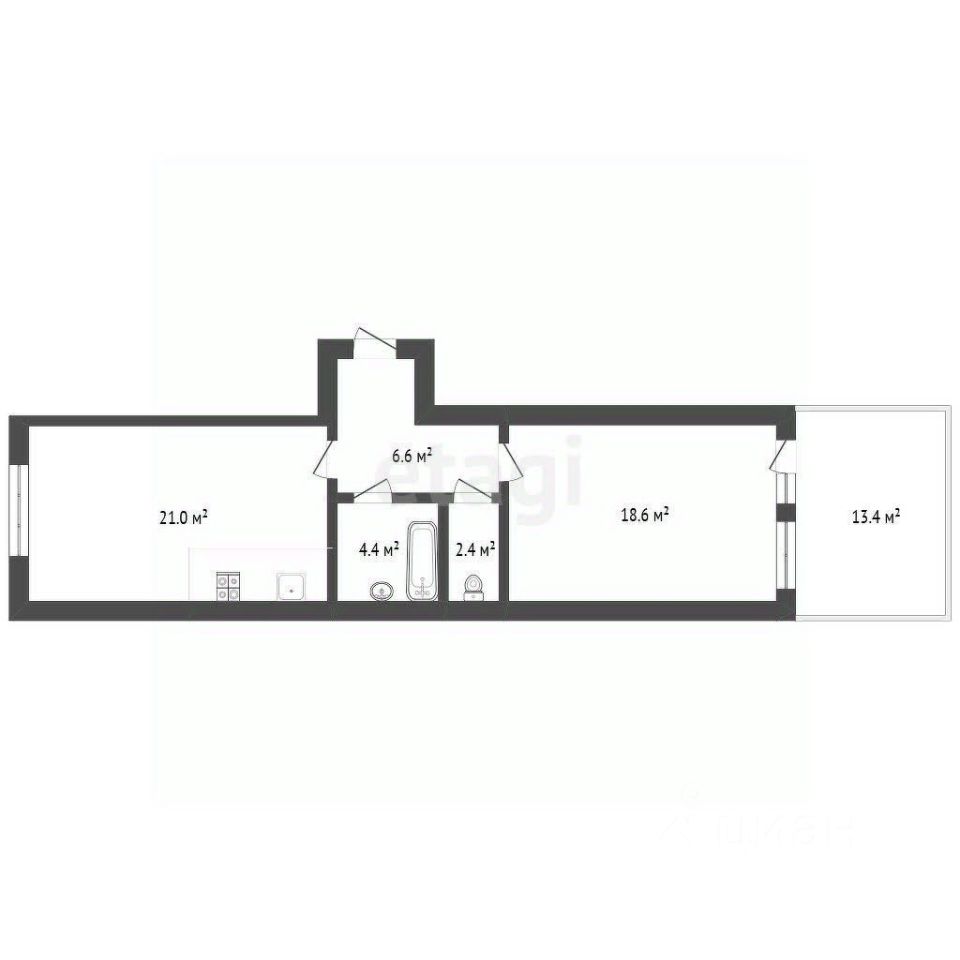 Общая площадь объекта недвижимости 57,09 метров квадратных. Площадь комнат составляет 18,6 м кв. . Площадь кухни - столовой 21  м.кв.