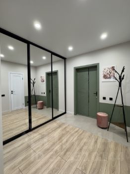 • Просторная прихожая с зеркалами во всю стену — визуально расширяет пространство