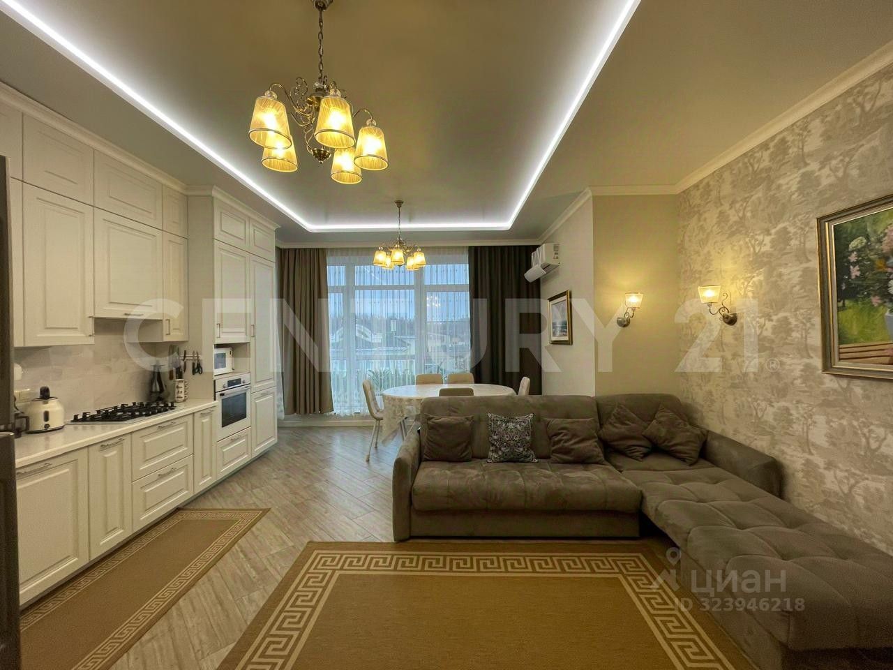 Гостиная: 31 кв. м, панорамные окна выходят на частный сектор, очень светлая, на полу керамогранит, водяные теплые полы подогреваются от газового котла фирмы BOSH. Сложные натяжные потолки с красивой подсветкой и дизайнерскими люстрами позволяют создавать комфортное освещение в любое время суток в любой зоне гостиной. Современный стильный и эргономичный кухонный гарнитур с каменной столешницей позволяет хозяйке решать любые задачи без хлопот.