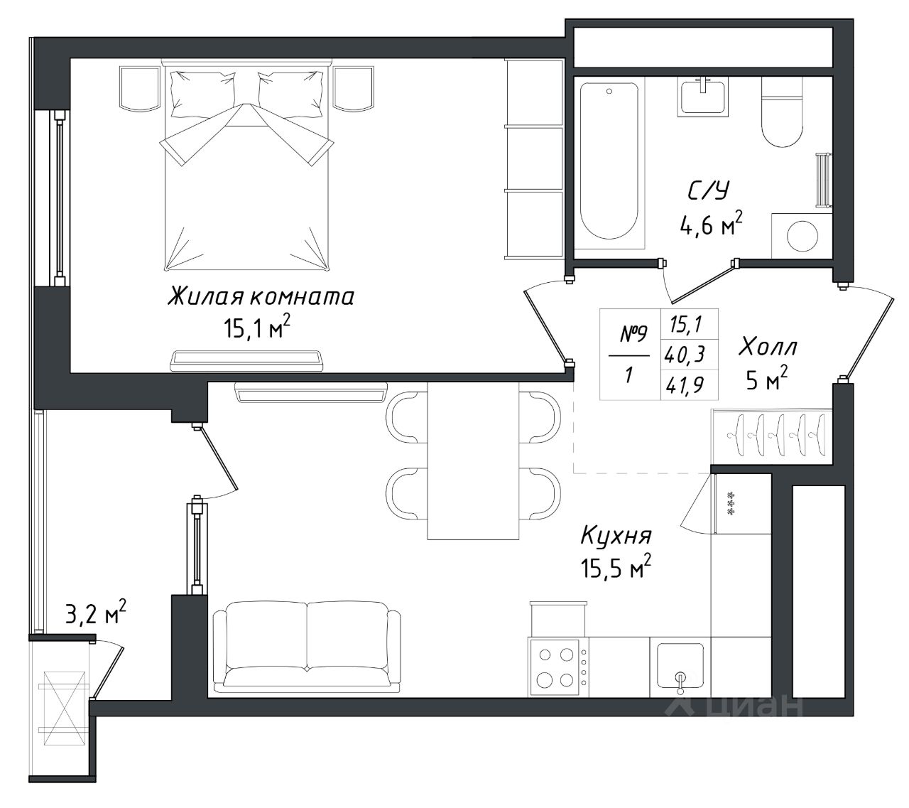 Жилая площадь15,1 м²