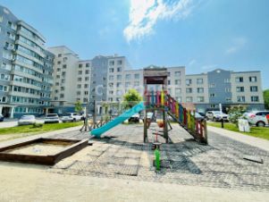 Во дворе детская площадка, за домом большая парковка и спорт площадка.