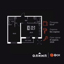 Продаётся 1-к квартира номер 58 общей площадью 53.7 кв.м. на 8-м этаже 24 этажного здания. Без отделки. Цена с учётом скидки.