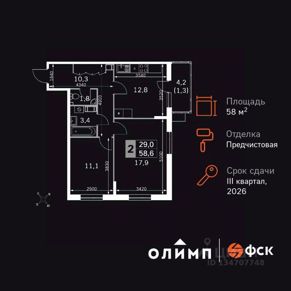 Продаётся 2-к квартира номер 57 общей площадью 58.6 кв.м. на 9-м этаже 22 этажного здания. Отделка Whitebox. Цена с учётом скидки.