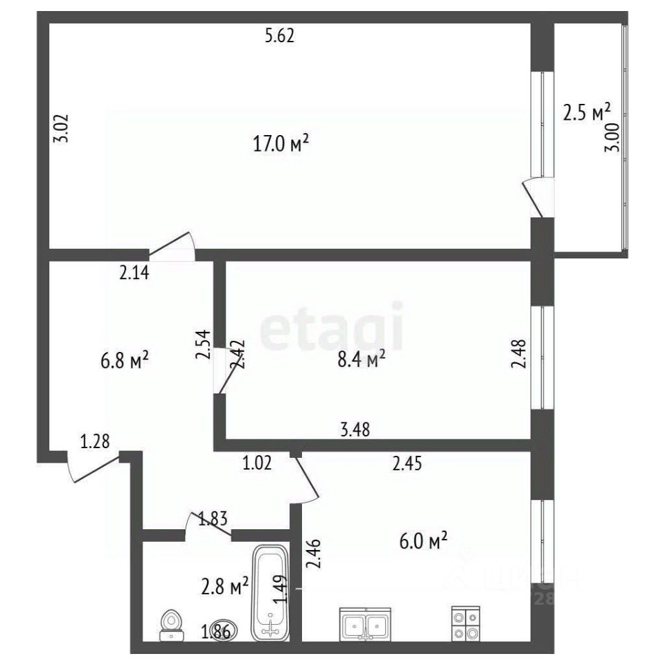 Oбщей площaдью 41,4 кв.м. (Жилaя 25,6м2, кухня 6,6м2)