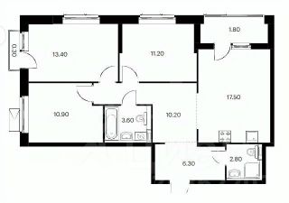 3 раздельные комнаты - 11.2 кв.м, 13.4 кв.м и 10.9 кв.м.