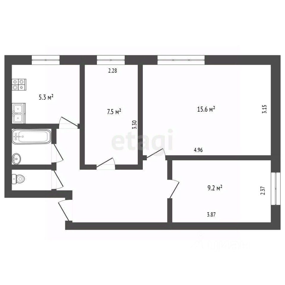 Планировка включает три изолированных комнаты площадью 9,2, 15 и 7,5 квадратных метров соответственно, каждая из которых может стать отдельным пространством для отдыха или работы. Санузел раздельный, что добавляет удобства в повседневную жизнь.