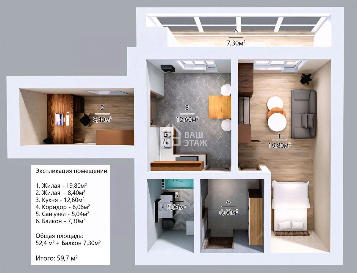 Квартира расположена на 10 этаже нового дома, сданного в 2021 году. Общая площадь с лоджией составляет 59,7 кв.м. Просторные изолированные комнаты (19,8 кв.м и 8,4 кв.м) позволяют с комфортом разместить семью или организовать личное пространство. Совместный санузел площадью 5,04 кв.м функционален и удобен. Предчистовая отделка — стены оштукатурены, полы выравнены — дает возможность воплотить любые дизайнерские идеи без лишних затрат. Большая лоджия 7 кв.м с панорамным остеклением наполняет пространство светом и открывает шикарный вид из окон. Квартира оборудована индивидуальным отоплением, что обеспечивает экономию и независимость в регулировании температуры.