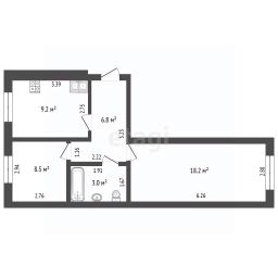 Двухкомнатная квартира площадью 45.7 м² расположена на первом этаже двухэтажного кирпичного дома 2013 года постройки. Объект предлагается в свободной продаже с возможностью приобретения по семейной ипотеке.
