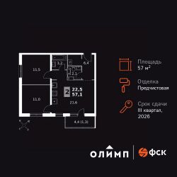 Продаётся 2-к квартира номер 173 общей площадью 57.1 кв.м. на 22-м этаже 24 этажного здания. Предчистовая отделка. Цена с учётом скидки.