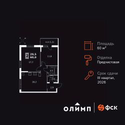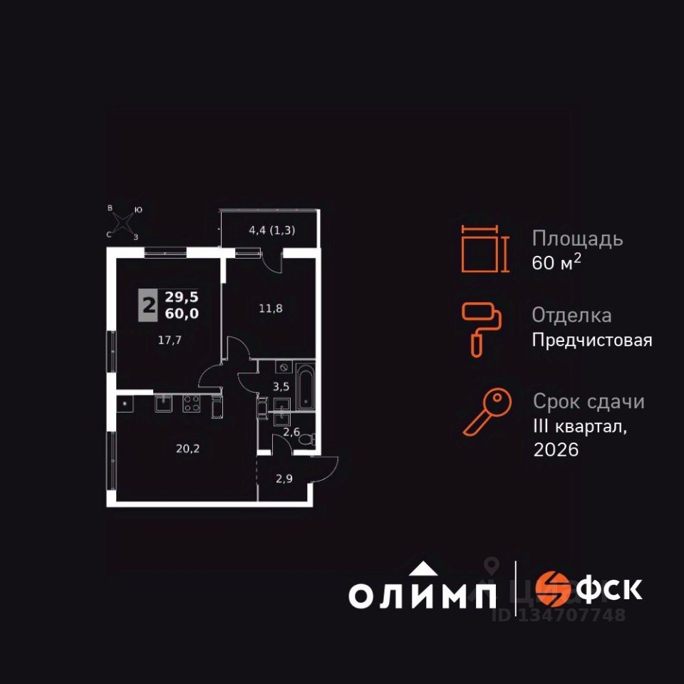 Продаётся 2-к квартира номер 174 общей площадью 60 кв.м. на 22-м этаже 24 этажного здания. Отделка Whitebox. Цена с учётом скидки.