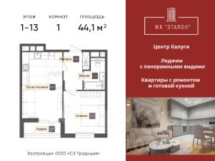 Просторная 1-комнатная квартира в ЖК "Эталон" (Калуга), площадь 44,1 м². Пре-панорамные окна выходят на юг, заполняя комнаты светом. Прямые виды на город и боковые - на Яченское водохранилище.