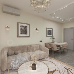Квартира полностью готова к проживанию: авторская отделка "под ключ", кухня с техникой, санузел укомплектован мебелью, встроенный шкаф и система тёплых полов. В доме — современная инженерия: отопление, вентиляция, кондиционирование и интернет.