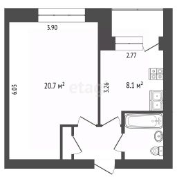 Ключевое преимущество — грамотная планировка с изолированной комнатой 20,7 кв.м, предоставляющей возможности для комфортной организации жилого пространства, и просторной кухней 8,1 кв.м с выходом на застекленную лоджию.