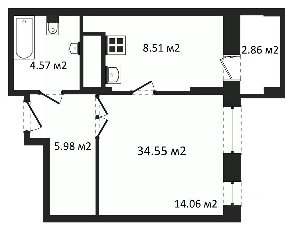 Отделка: стены, полы и потолки без отделки, произведена гидроизоляция полов в санузле, ввод труб водоснабжения и канализации в квартиру (стояки), установка входной двери и счетчиков, остекление оконных блоков и лоджии.