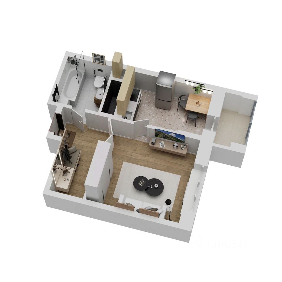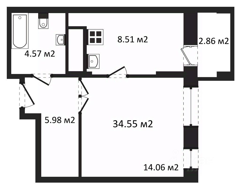 Отделка: стены, полы и потолки без отделки, произведена гидроизоляция полов в санузле, ввод труб водоснабжения и канализации в квартиру (стояки), установка входной двери и счетчиков, остекление оконных блоков и лоджии.