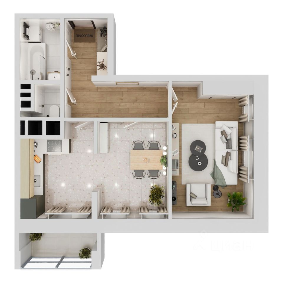Отделка: стены, полы и потолки без отделки, произведена гидроизоляция полов в санузле, ввод труб водоснабжения и канализации в квартиру (стояки), установка входной двери и счетчиков, остекление оконных блоков и лоджии.