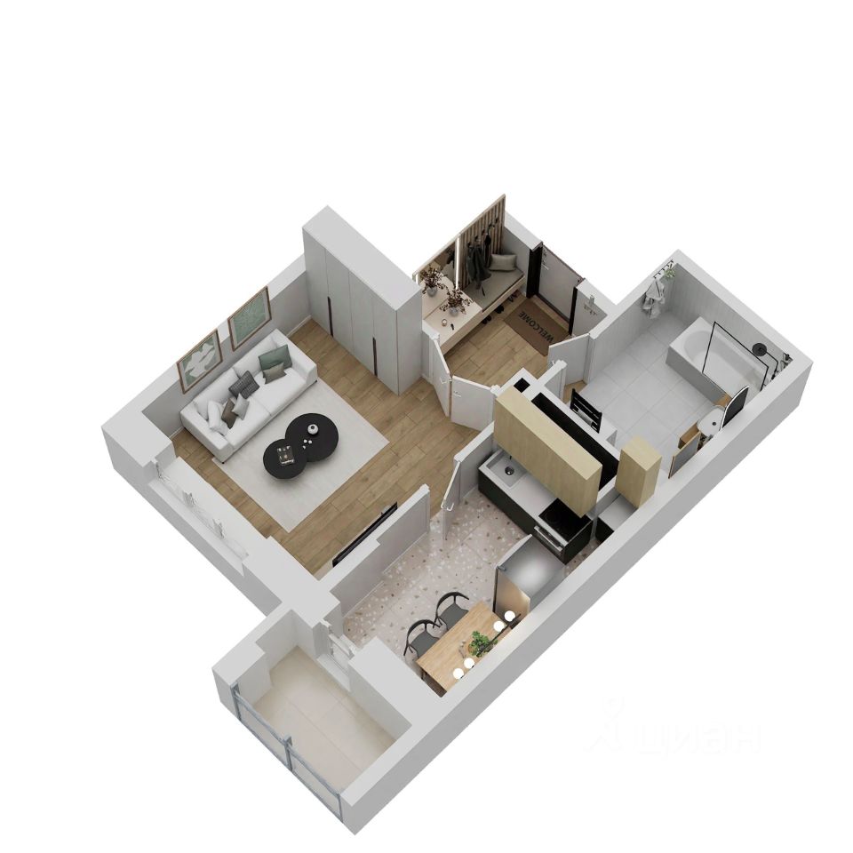 Отделка: стены, полы и потолки без отделки, произведена гидроизоляция полов в санузле, ввод труб водоснабжения и канализации в квартиру (стояки), установка входной двери и счетчиков, остекление оконных блоков и лоджии.