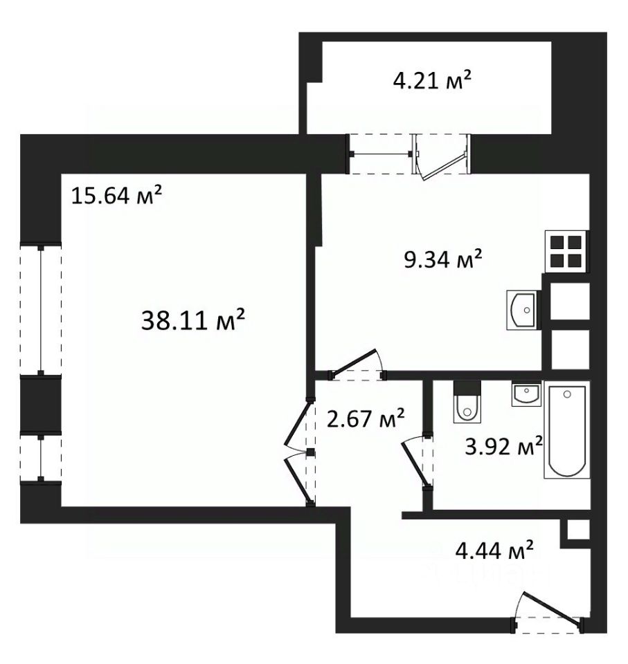 Отделка: стены, полы и потолки без отделки, произведена гидроизоляция полов в санузле, ввод труб водоснабжения и канализации в квартиру (стояки), установка входной двери и счетчиков, остекление оконных блоков и лоджии.