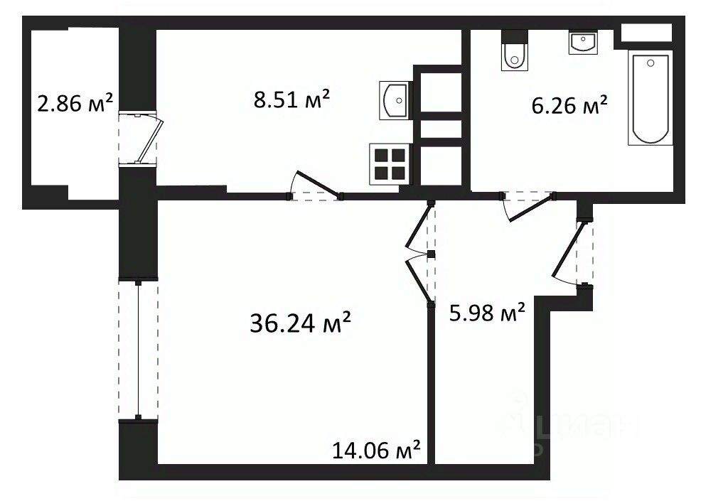 Отделка: стены, полы и потолки без отделки, произведена гидроизоляция полов в санузле, ввод труб водоснабжения и канализации в квартиру (стояки), установка входной двери и счетчиков, остекление оконных блоков и лоджии.