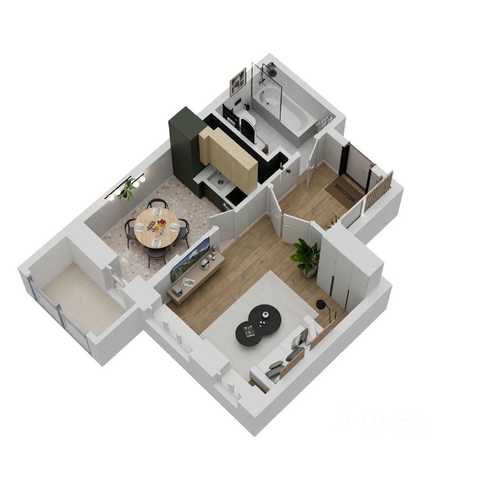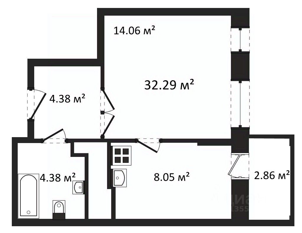 Отделка: стены, полы и потолки без отделки, произведена гидроизоляция полов в санузле, ввод труб водоснабжения и канализации в квартиру (стояки), установка входной двери и счетчиков, остекление оконных блоков и лоджии.