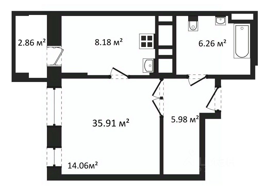 Отделка: стены, полы и потолки без отделки, произведена гидроизоляция полов в санузле, ввод труб водоснабжения и канализации в квартиру (стояки), установка входной двери и счетчиков, остекление оконных блоков и лоджии.