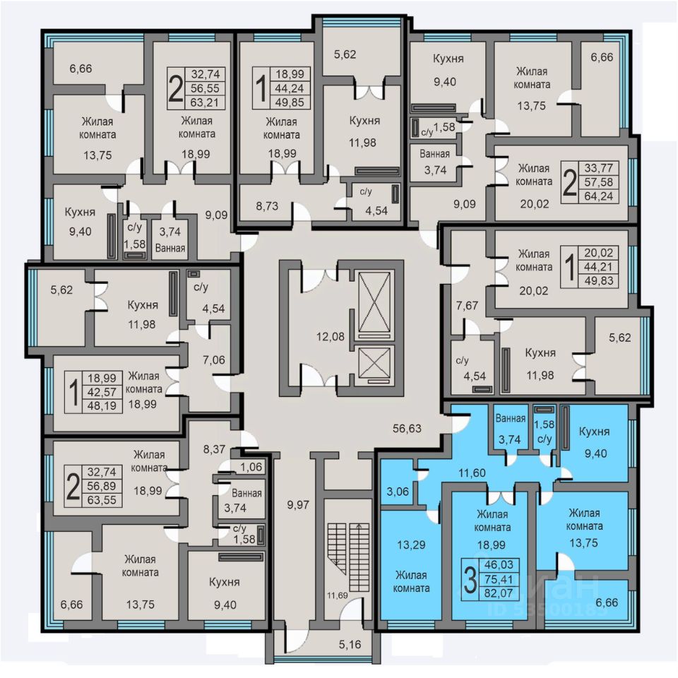 Продаётся 3-комнатная квартира в строящемся доме (Дом 15а), срок сдачи: III-кв. 2026, общей площадью 82.07 кв.м., на 15 этаже.