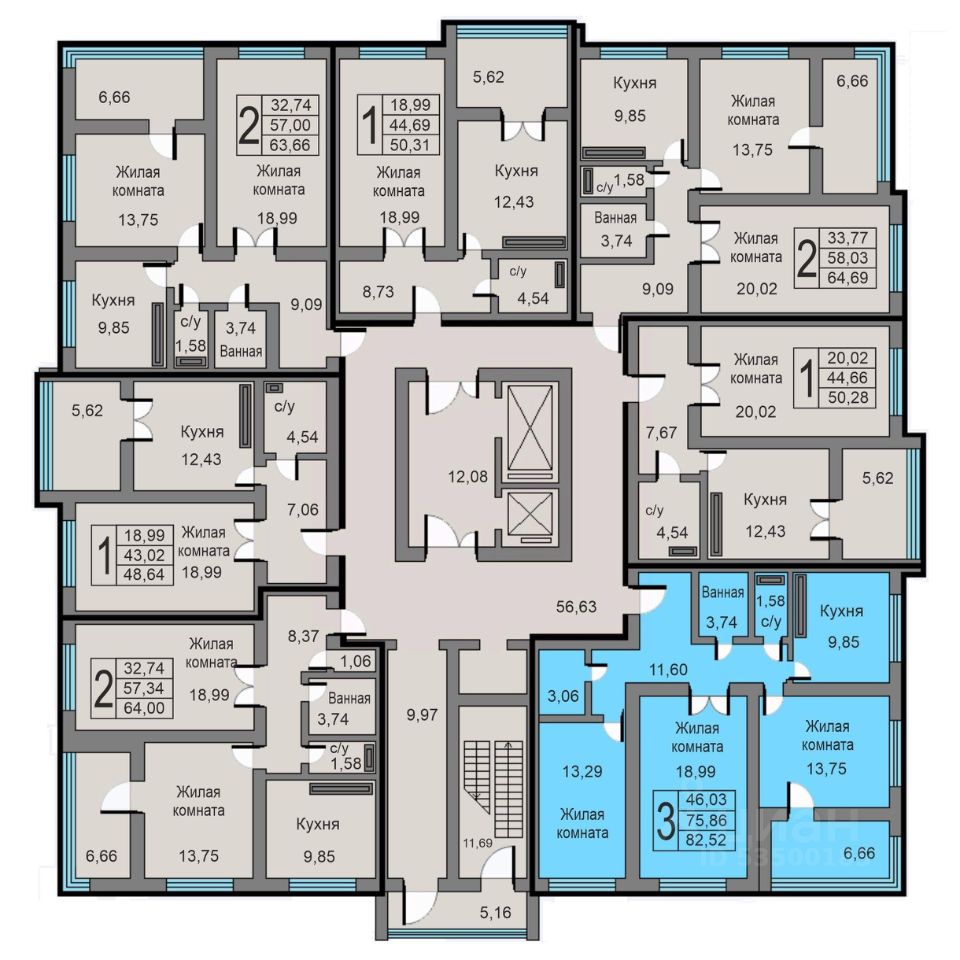 Продаётся 3-комнатная квартира в строящемся доме (Дом 15а), срок сдачи: III-кв. 2026, общей площадью 82.52 кв.м., на 7 этаже.