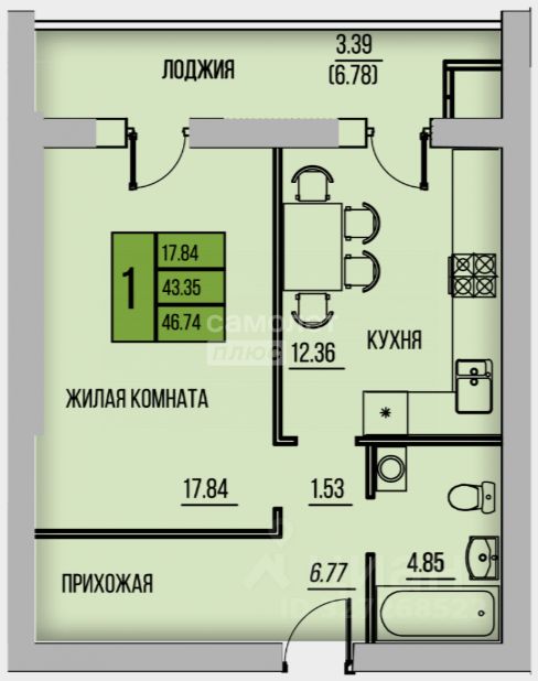 Площадь 46,9 кв.м., комната 17,4 кв.м., кухня 12,36 кв.м., лоджия 6,8 кв.м., совмещенный сан.узел.