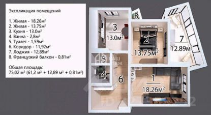 Квартира расположена на 4 этаже 19-этажного панельного дома, сдавшегося в 2025 году. Общая площадь составляет 75,02 кв.м, включая жилую зону 32,01 кв.м, просторную кухню 13,0 кв.м, а также большую лоджию 12,89 кв.м с французским остеклением от пола до потолка и французский балкон 0,81 кв.м. В квартире выполнена предчистовая отделка: выровнены пол и стены, разведена электрика, что позволяет вам легко воплотить свои дизайнерские идеи. Отдельно стоит отметить видовые характеристики — из окон открывается прекрасный вид, а наличие индивидуальных счетчиков на отопление помогает сильно сэкономить в зимнем сезоне, раздельный санузел добавляет практичности.