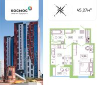 Продается однокомнатная квартира номер 24 в новостройке ЖК "Космос 2.0" по адресу: г. Обнинск, район Заовражье, Табулевича 5 п.1. Общая площадь квартиры 45.27 кв.м., этаж 4 из 19.