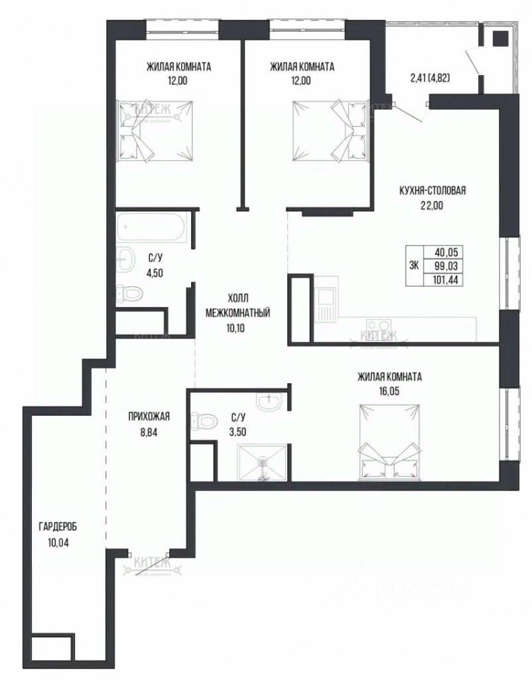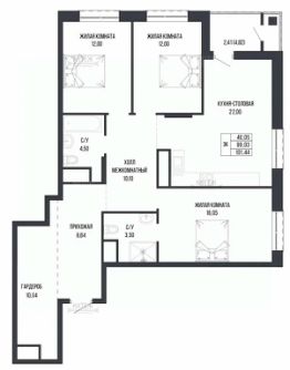 В продаже 3-комн. квартира 101,4 кв.м. с изолированными комнатами 16,1 + 12 + 12 кв.м. и кухней-столовой 22 кв.м. Из кухни выходит лоджия 4,8 кв.м. Два полноценных санузла. При входе в квартиру вместительная гардеробная 10 кв.м.
