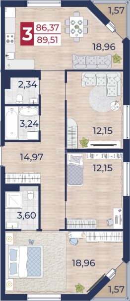 Удобная и функциональная планировка идеально подойдёт для семьи: три изолированные спальни обеспечат каждому члену семьи личное пространство, а просторная кухня-гостиная станет отличным местом для совместных ужинов и отдыха.
