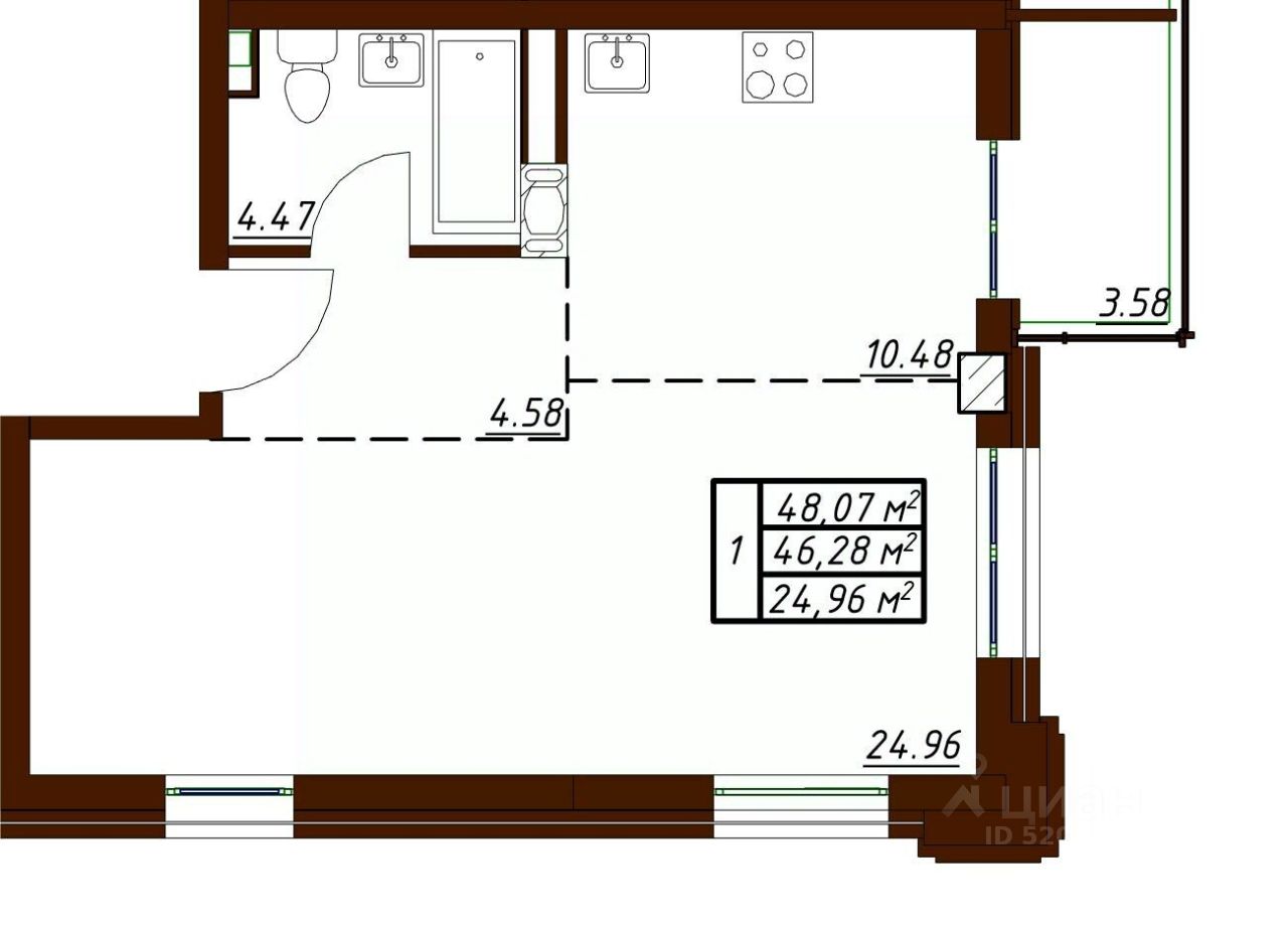 Продается 1-комн. квартира, 48,07 м²