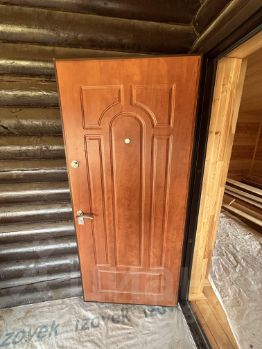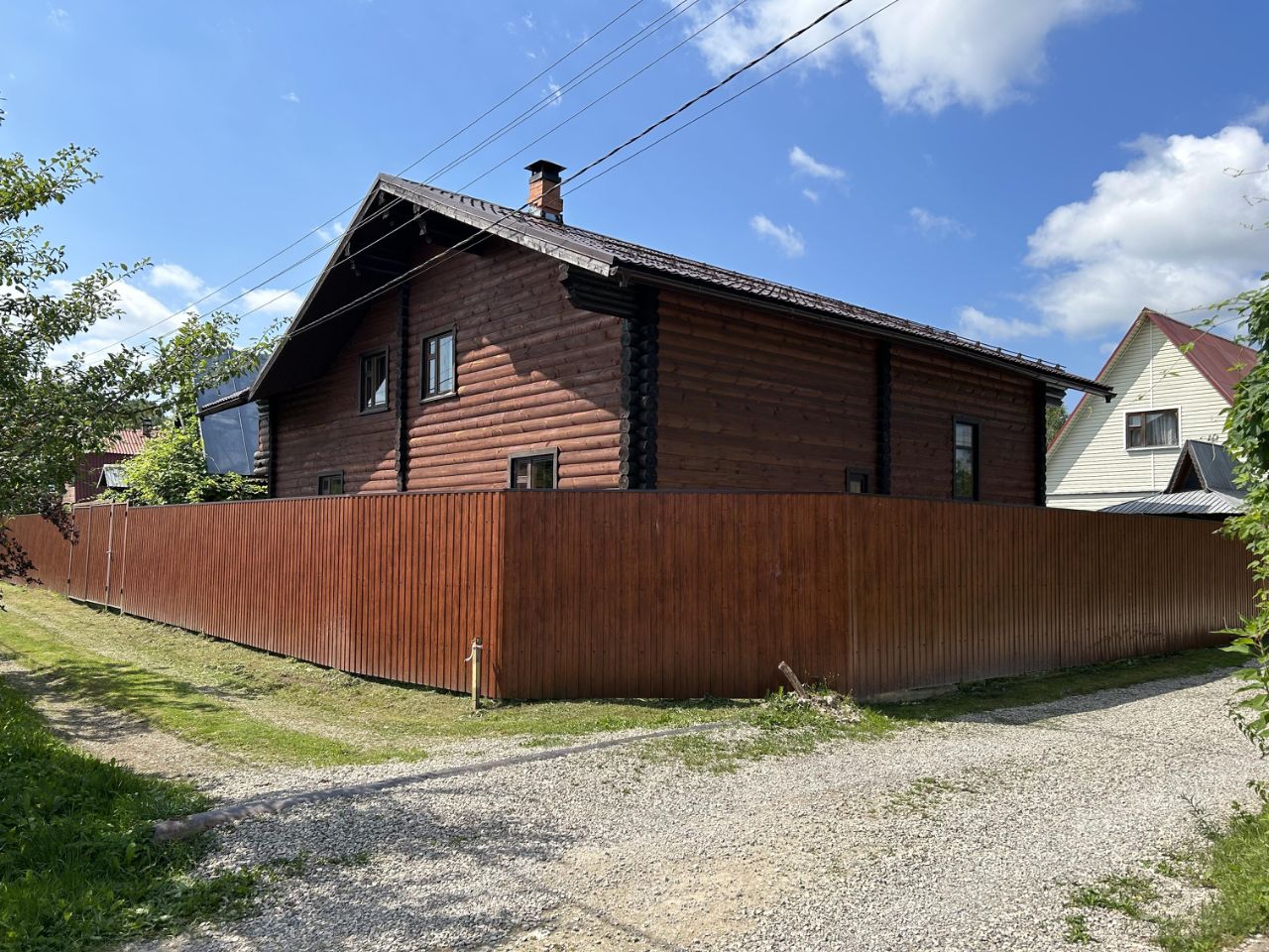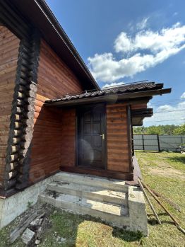 ДОМ: Дом 2-этажный, 142 м² (10,5х13,5), коричневого цвета, выполнен из оцилиндрованного бревна (привозилось из Псковской области), снаружи также покрыт блок-хаусом, окна деревянные, двухстворчатые, внутри готовые потолки и стены (вагонка), фундамент плитно-ленточный, имеется подвал (погреб), две входные двери, крыльцо, ступени, крыша - металлочерепица, имеются снегозадержатели.