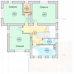 Первый этаж: Большая терраса, через которую вход в дом. Просторная кухня-гостиная со своей кладовой. Гостевая спальня или кабинет. Санузел. Бойлерная.
