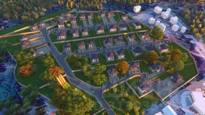 Закрытая территория со входной группой. Асфальтированные дороги. Освещенные улицы. Коммуникации под землей (электричество, газ, центральное водоснабжение).