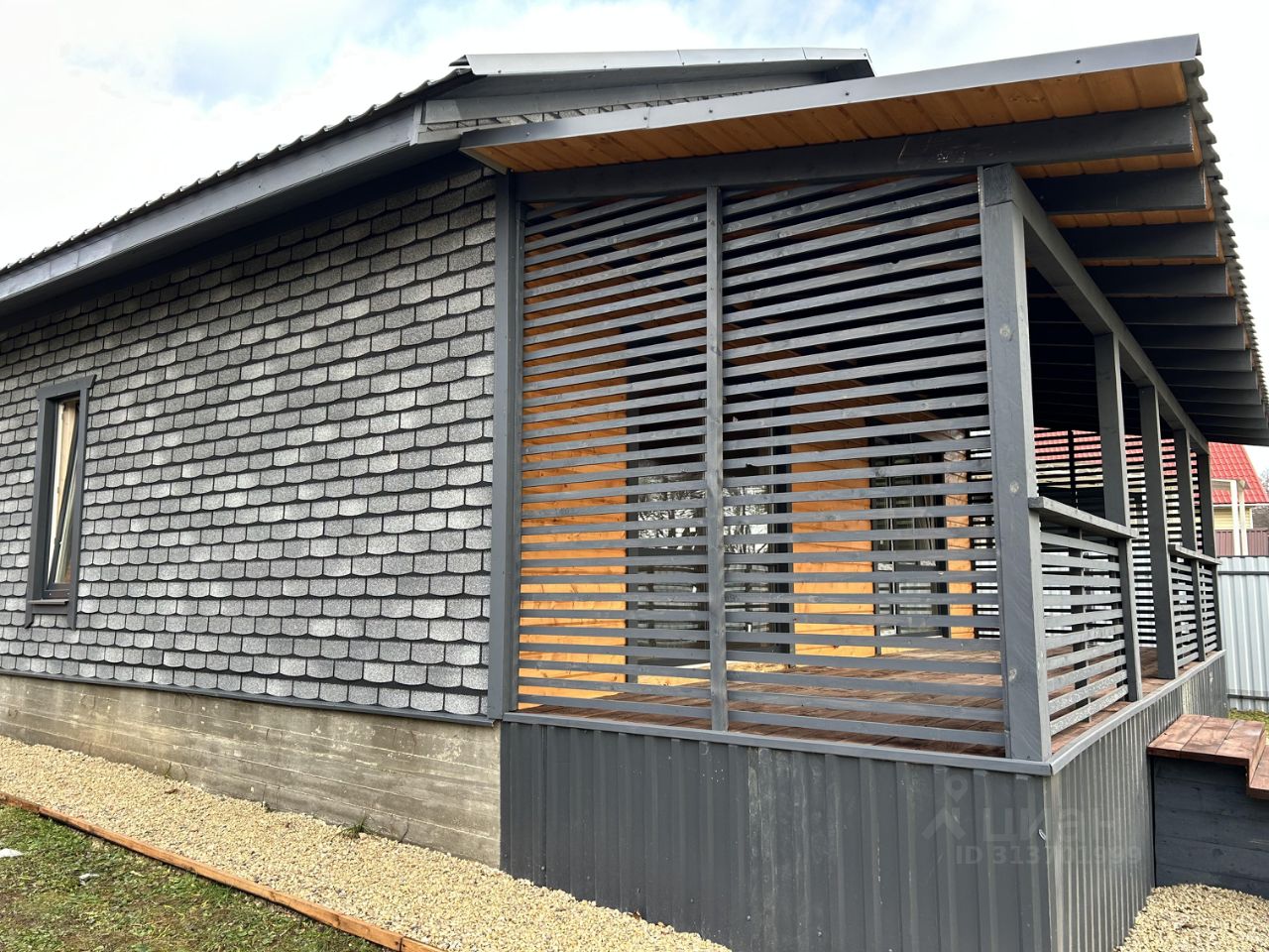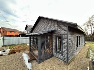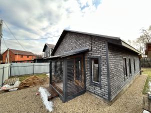 Внутри отделка: пол комбинированный (плитка/ламинат), стены (внутри) - имитация бруса, снаружи фасадная плитка Хауберк, потолок натяжной.
