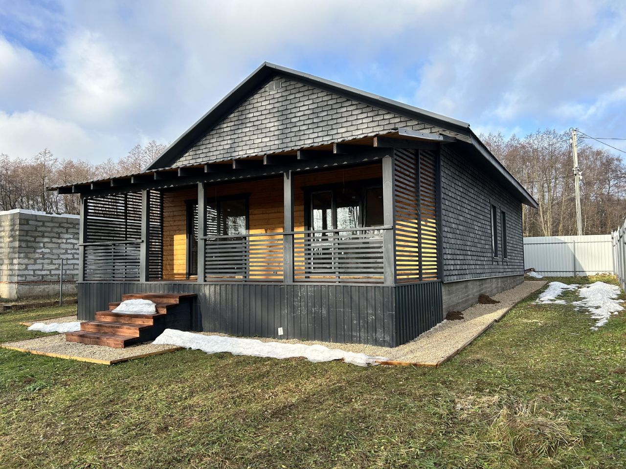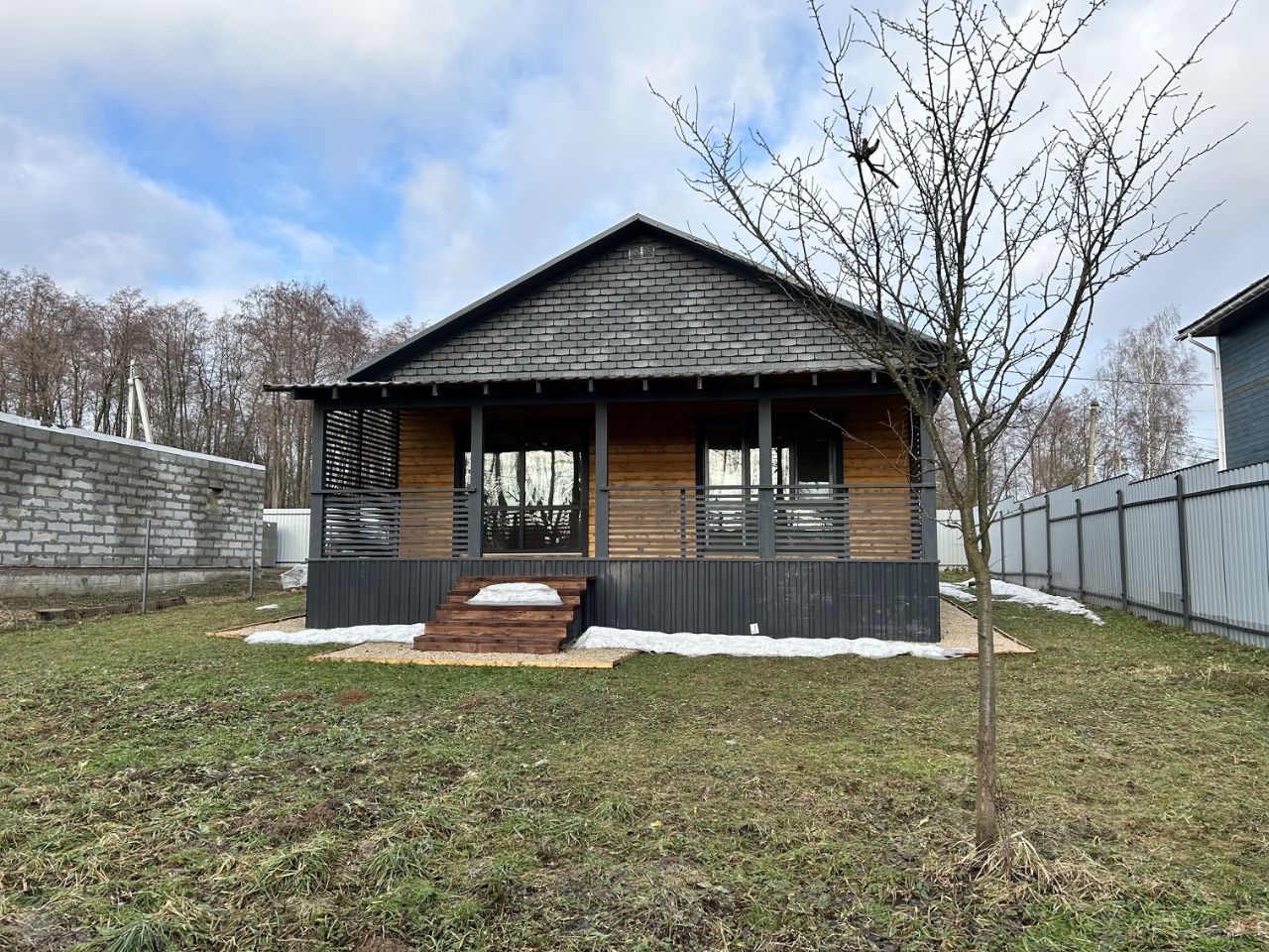 фундамент - монолитная плита, крыша металлочерепица, окна двойные стеклопакеты поворотно-откидные. Планировка: прихожая, бойлерная (где будет установлен дополнительный туалет), кухня-гостиная с выходом на террасу- откуда прекрасный вид на лес, санузел, 3 спальни (одну можно переделать под гардеробную)