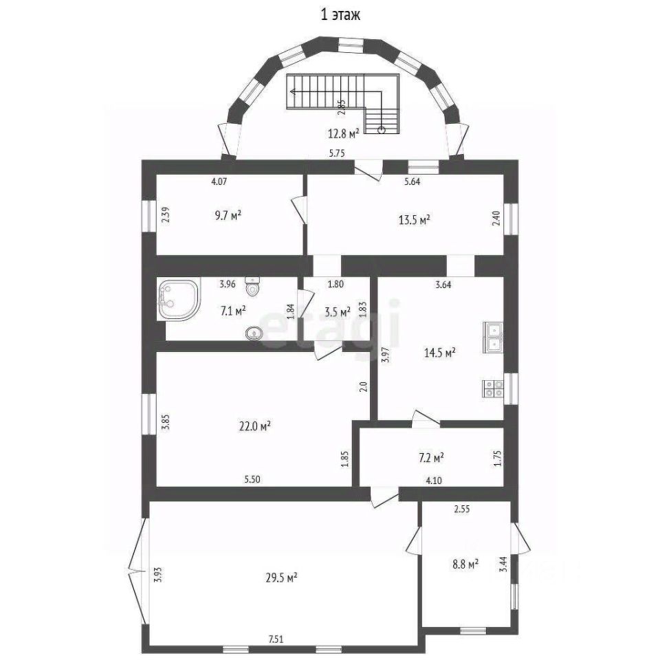 На 1 этаже расположена комната, просторная кухня-гостинная, прихожая, бойлерная, санузел, выход в отапливаемый гараж.