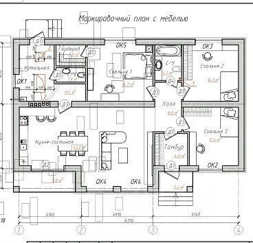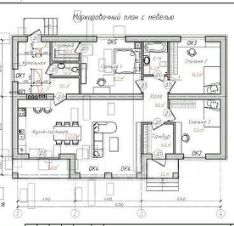 Планировка дома большая кухня-гостиная, холл, с/узел, три спальни.