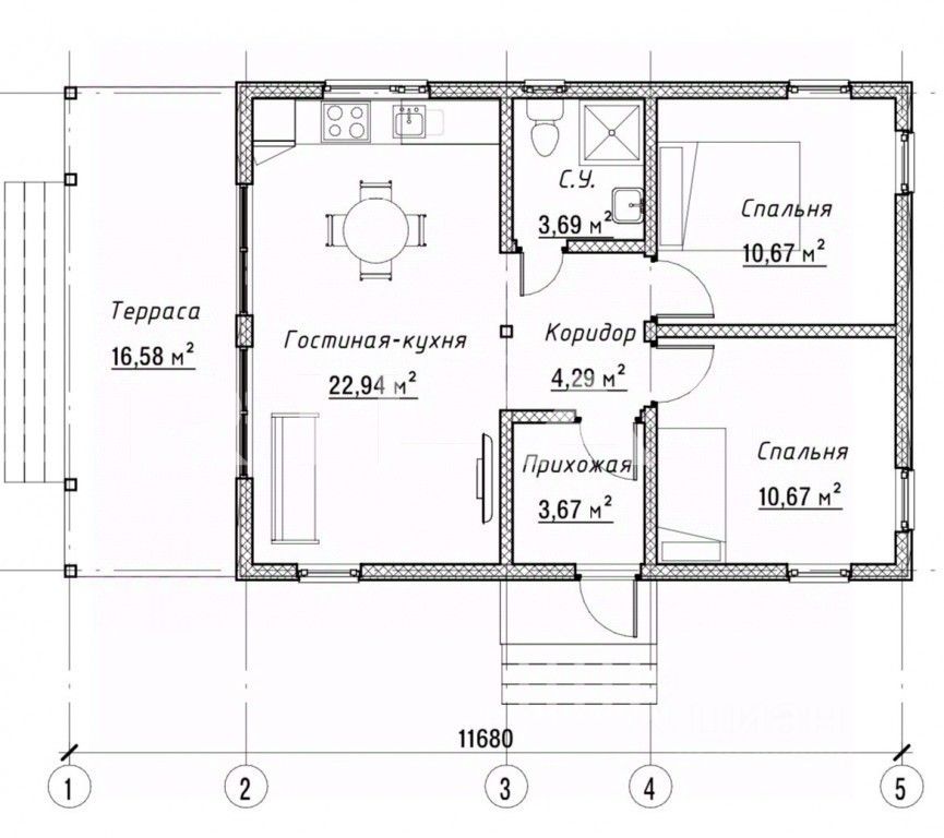 Кухня-гостиная 24 м² с выходом на террасу пространство наполнено светом и воздухом.